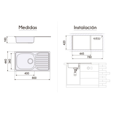 Fregadero 80x44 Viena sobre encimera 1C 1E. Modelo de una cubeta y escurridor para hacer de su cocina un lugar práctico y funcional.