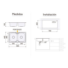 Fregadero 2C 80x44 Dublín, diseño de dos cubetas fabricado en acero inoxidable AISI 304.